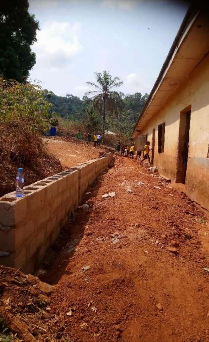 Les travaux engagés à l’école du bas se poursuivent. Un mur de soutènement est en cours de construction pour empêcher la terre d’envahir portes et fenêtres (la base brune du mur était enfouie sous la terre avant les premiers travaux de terrassement). Viendra ensuite le temps d’équiper le bâtiment en portes et fenêtres, puis en tables et chaises.